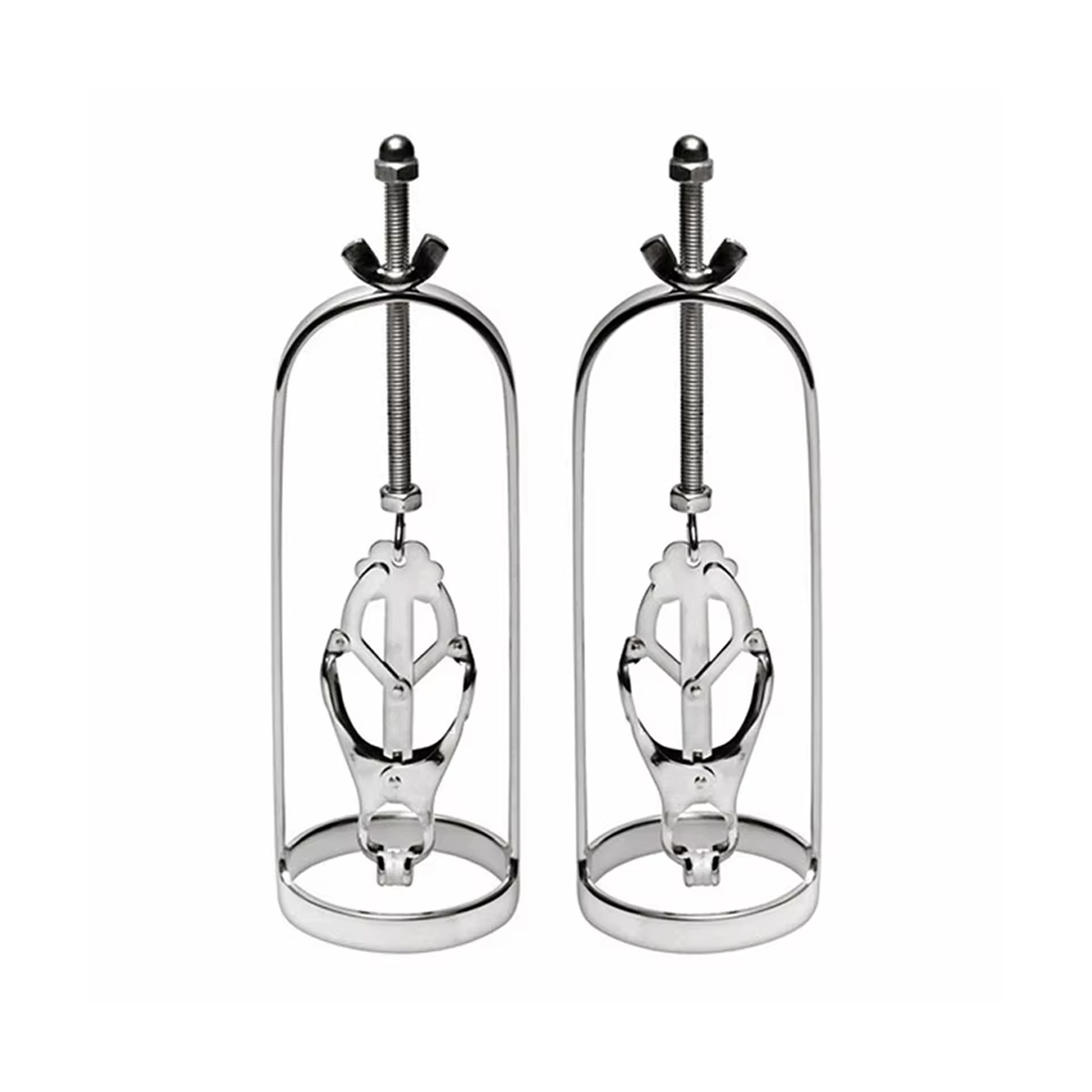 Zeer luxe en gedetailleerde RVS tepelklemmen, volledig verstelbaar voor extreme (BD)SM-ervaringen. Dankzij de lange draaischroeven kunnen deze klemmen naar een zeer hoge pijngrens worden afgesteld, maar ze zijn ook geschikt voor minder harde stimulatie. De set bevat 2 stuks, elk met een gewicht van 300 gram. Afmetingen verpakking: 25 cm hoog, 30 cm lang, 50 cm breed.