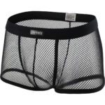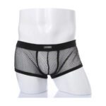 De BDSM visnet boxershort voor heren is een erotisch stuk herenondergoed dat ontworpen is om te verleiden en de zintuigen te prikkelen. Deze boxershort combineert de sensuele eigenschappen van visnetmateriaal met het provocerende effect van faux leer, waardoor een uitdagende en opwindende look ontstaat.