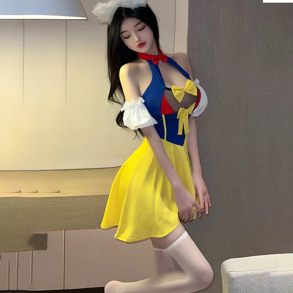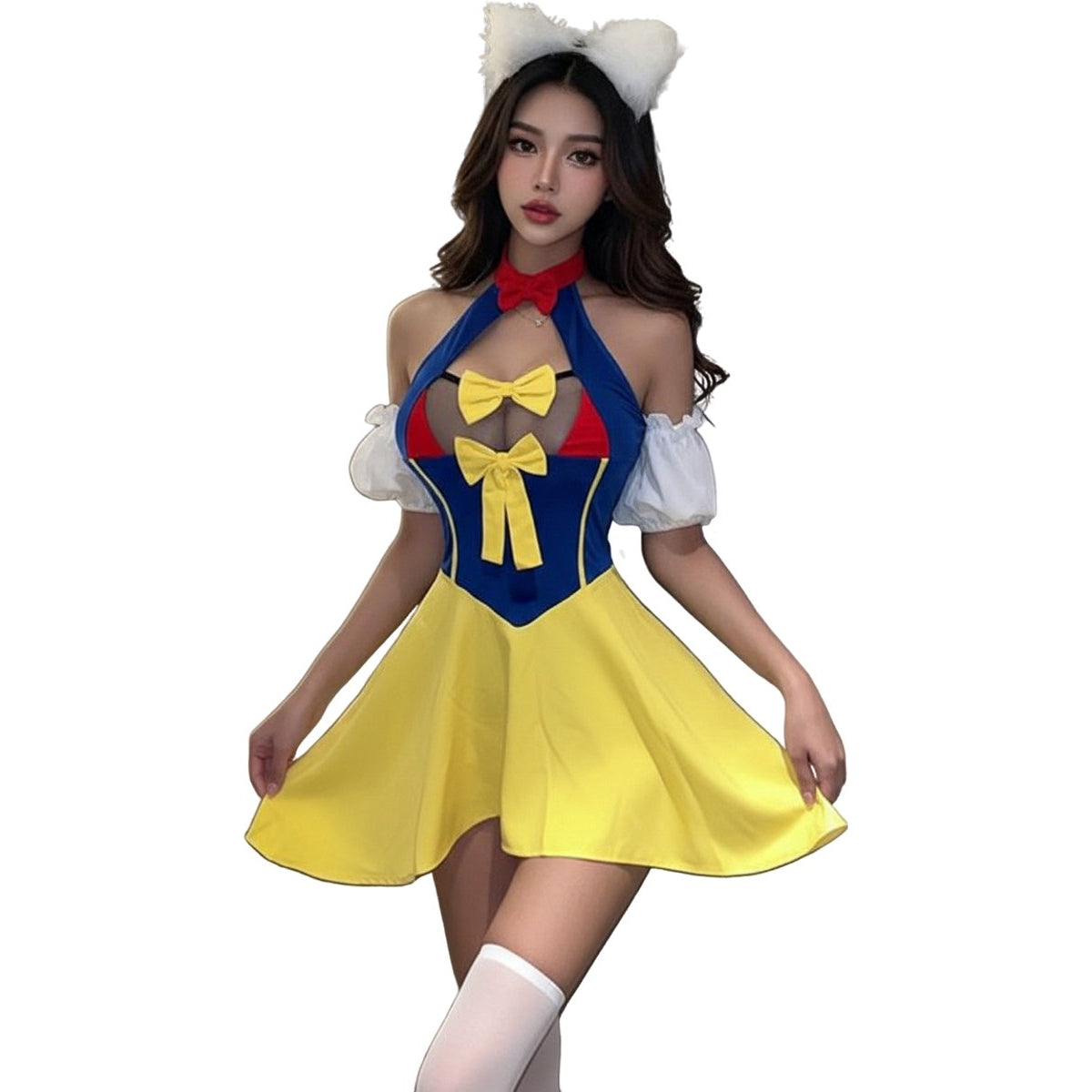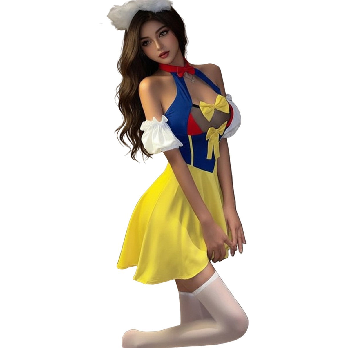 Het kenmerkende diepe decolleté van het pakje zorgt voor een sexy en uitdagende uitstraling, terwijl de wijde minirok speelsheid toevoegt aan de look. De bijpassende panty kousen voegen een extra vleugje verleiding toe, waardoor het pakje compleet wordt.