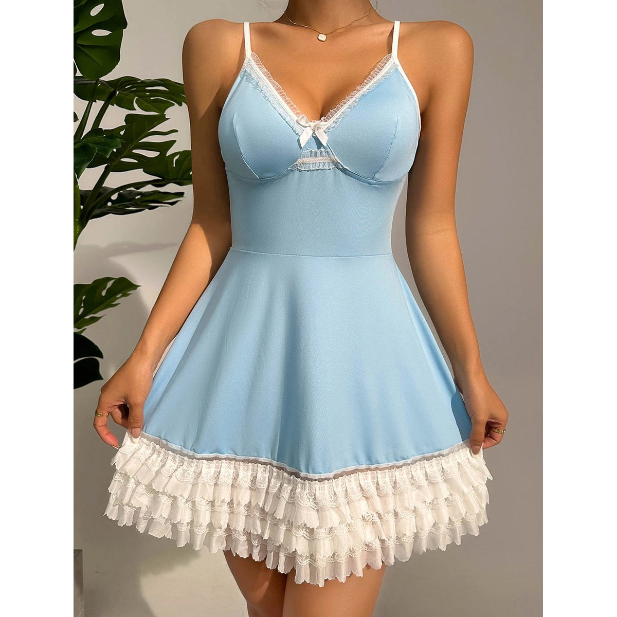 Met zijn delicate kanten details en een sensuele snit, omhult deze nachtjurk je in weelde en verleiding, terwijl de strakke, sexy V-hals je rondingen subtiel benadrukt. De speelse paraplu rok voegt een vleugje speelsheid toe aan je nachtelijke look, terwijl het toch een tijdloze elegantie behoudt.