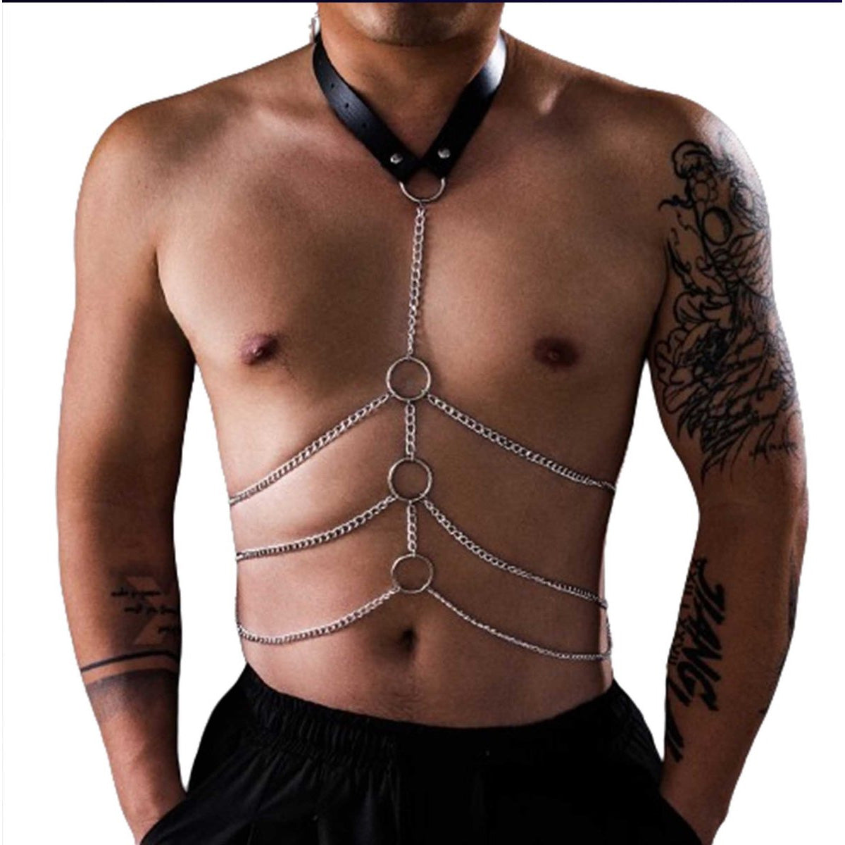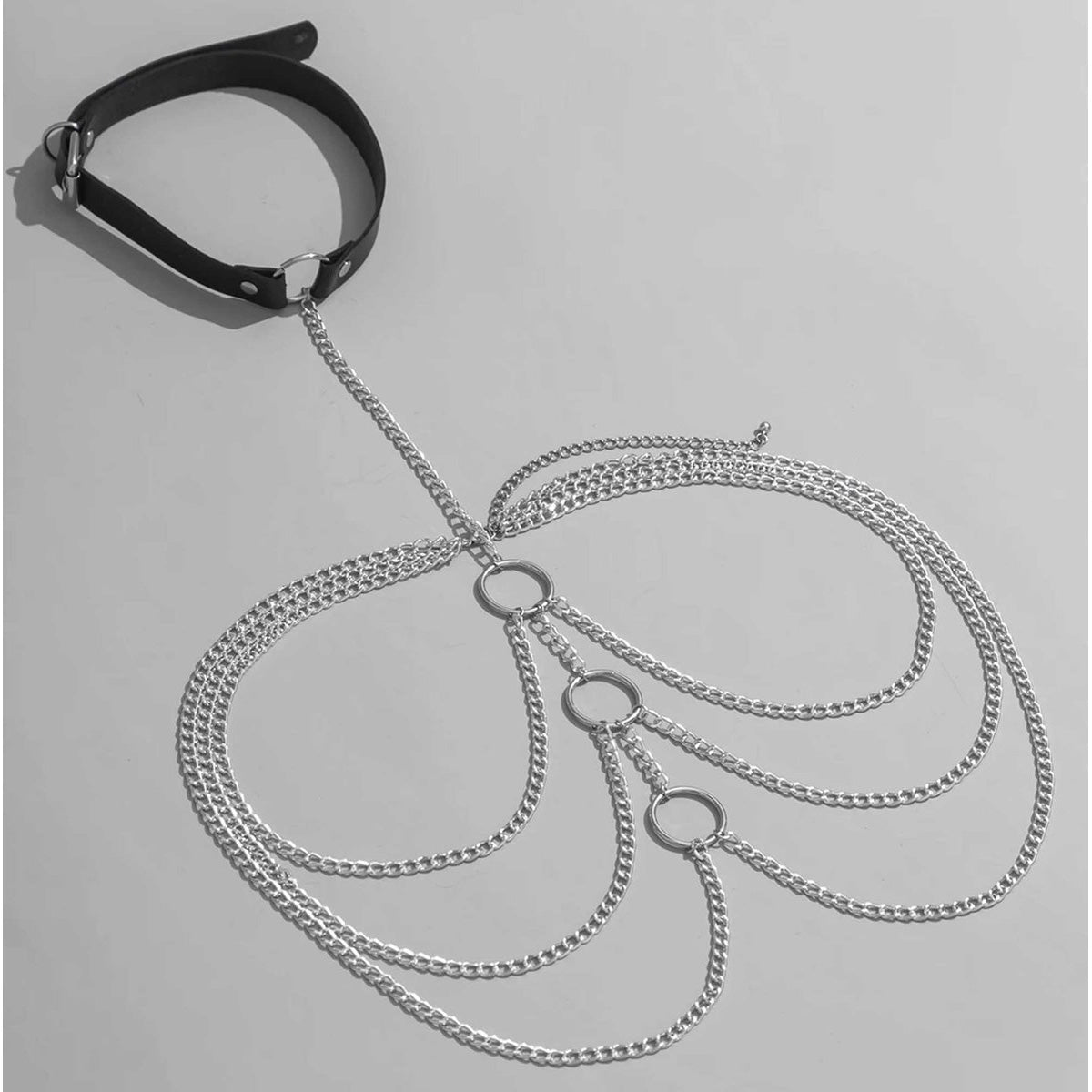 Ontketen je innerlijke verlangens en omhul jezelf in de ultieme verleiding met ons BDSM romp harnas. Dit meesterlijke stuk is vervaardigd uit een combinatie van premium leer en roestvrijstalen kettingen, ontworpen om je te laten schitteren in elke erotische setting.