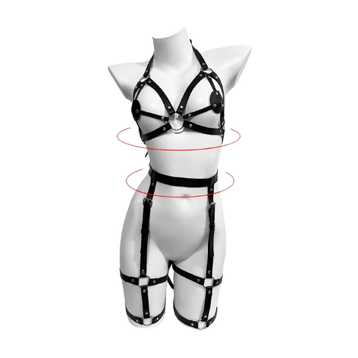 Dit pikante 2-delige bondage harnas is een uitdagende keuze voor liefhebbers van (BD)SM en rollenspellen. Het harnas wordt geleverd als een borstharnas en een bovenbeen/heup harnas, en is gemaakt van hoogwaardig leder van goede kwaliteit. Het beha harnas heeft een verleidelijk ontwerp dat de borsten accentueert en zorgt voor een sexy uitstraling. Het heeft verstelbare bandjes voor een perfecte pasvorm en kan worden aangepast aan verschillende lichaamsvormen en maten. Het benenharnas heeft ook verstelbare bandjes.