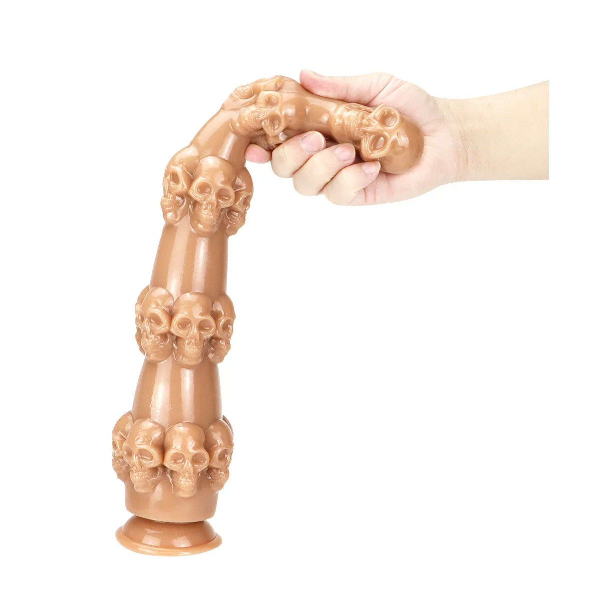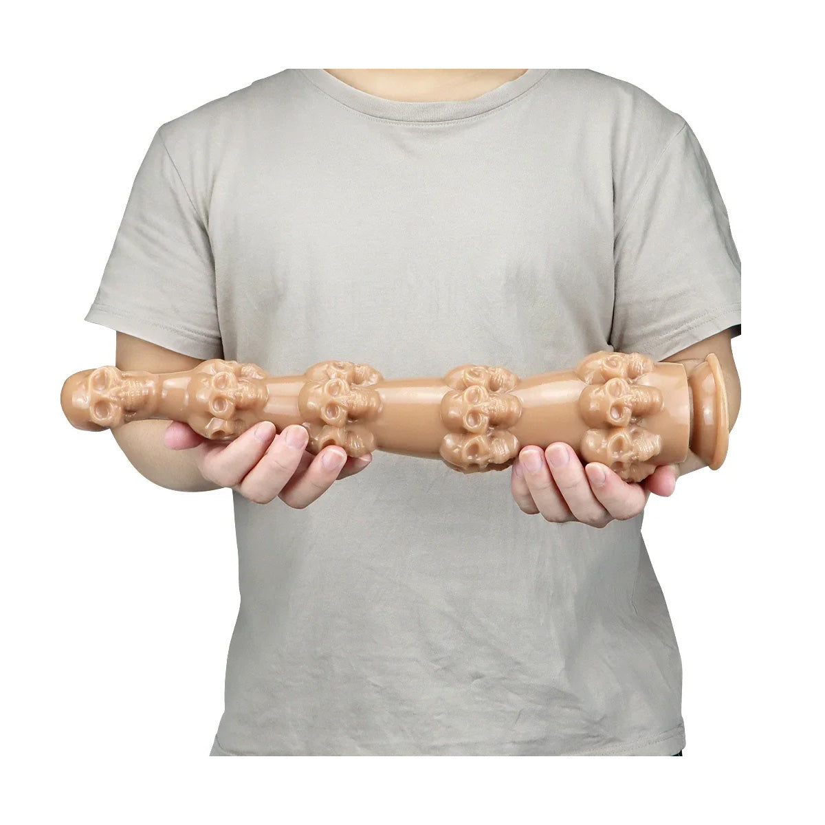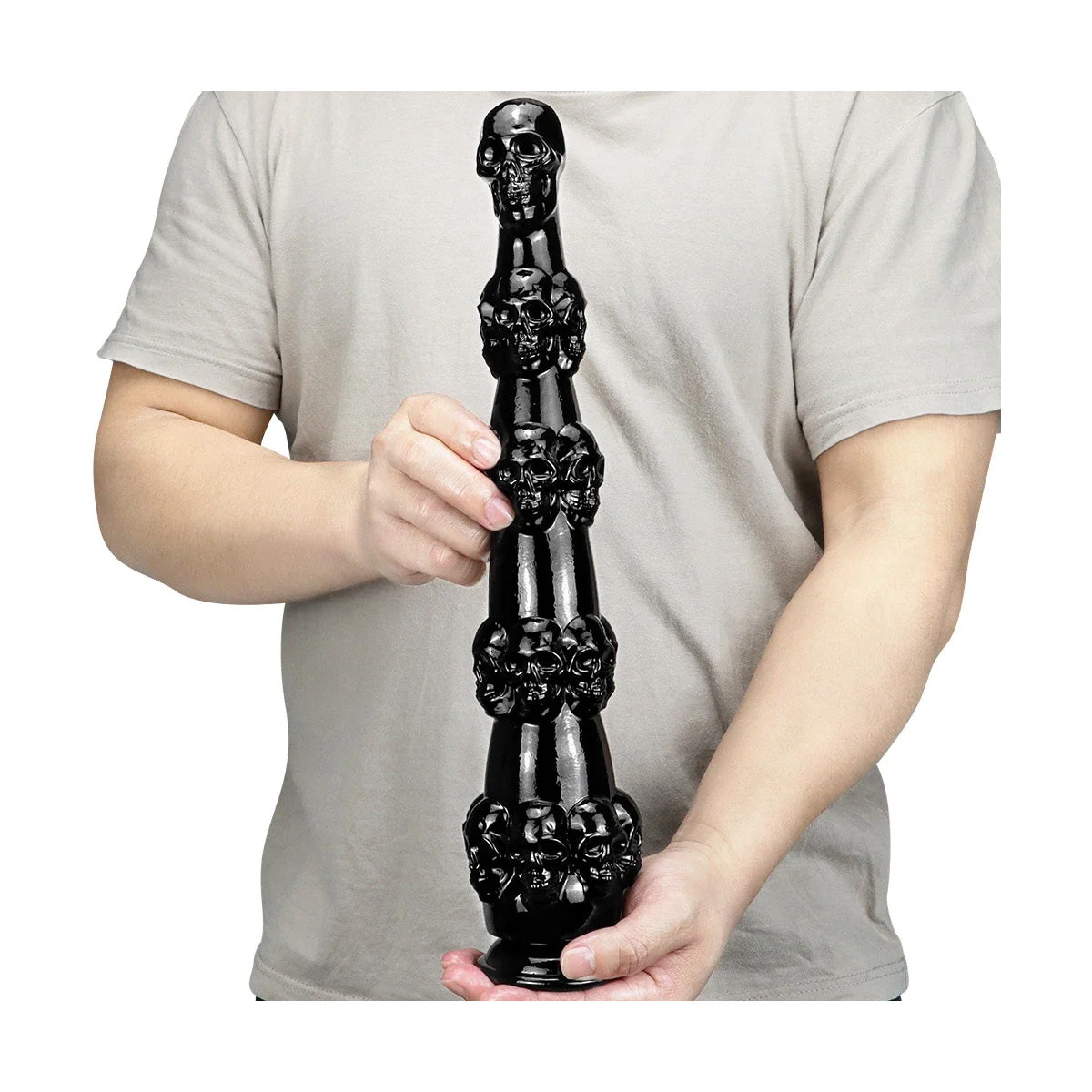 Mega lange buttplug van maarliefst 37 centimeter lang. De plug is op zijn breedste punt maar liefst 7,5 centimeter en op zijn minst brede punt 4,3 centimeter. De plug heeft doodshoofden aan de onzichtbare als afwerking waardoor het een leuke uitstraling heeft maar het belangrijkste is dat deze doodshoofden gedetailleerd zijn afgewerkt waardoor en extra stimulatie ontstaat door de randen en ribbels van deze doodshoofden. De plug staat garant voor extreem genot en brengt je hoogtepunten naar nieuwe intense hoogtes. De plug is van hoge kwaliteit siliconen gemaakt.