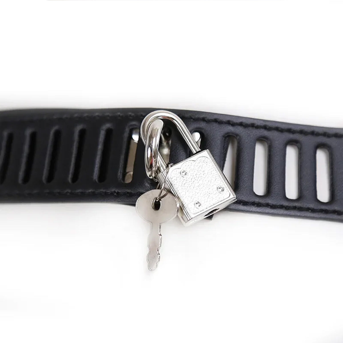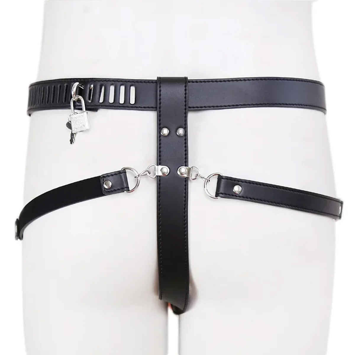 Zeer luxe erotische lederen kusheidsboxer. De string is voorzien van sloten aan beide zijden en die aan de 'sleeve' van de penis vastzitten. Deze zijn verstelbaar aan de kettingen waaraan de sloten zitten, waardoor je de penis zo strak in de mouw kunt binden zoals je zelf wilt. Aan de onderzijde van de 'sleeve' zit een opening waar de penis doorheen komt. Als je onderbroek op zijn strak zet is het bijna onmogelijk om de penis stijf te krijgen, waardoor het zeer geschikt is voor uitdagende bdsm dates. De man geil maken maar zijn penis niet stijf laten worden is iets waar iedereen nog meer schadelijke van beïnvloedt. Op het moment dat je de penis wat meer ruimte geeft door de sloten wat minder strak aan te sluiten is het mogelijk om de penis stijf te laten worden en inclusief ook seks te hebben terwijl je de onderbroek gebruikt.