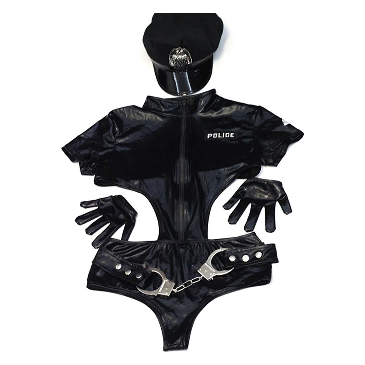De bodysuit omhelst het lichaam op een flatterende manier, met accenten die zowel ondeugend als stijlvol zijn. De dominante politiepet en handschoenen voegen een essentiële autoriteit en speelsheid toe aan het geheel, terwijl de bijgevoegde handboeien een speels element van verrassingen en anticipatie bieden.