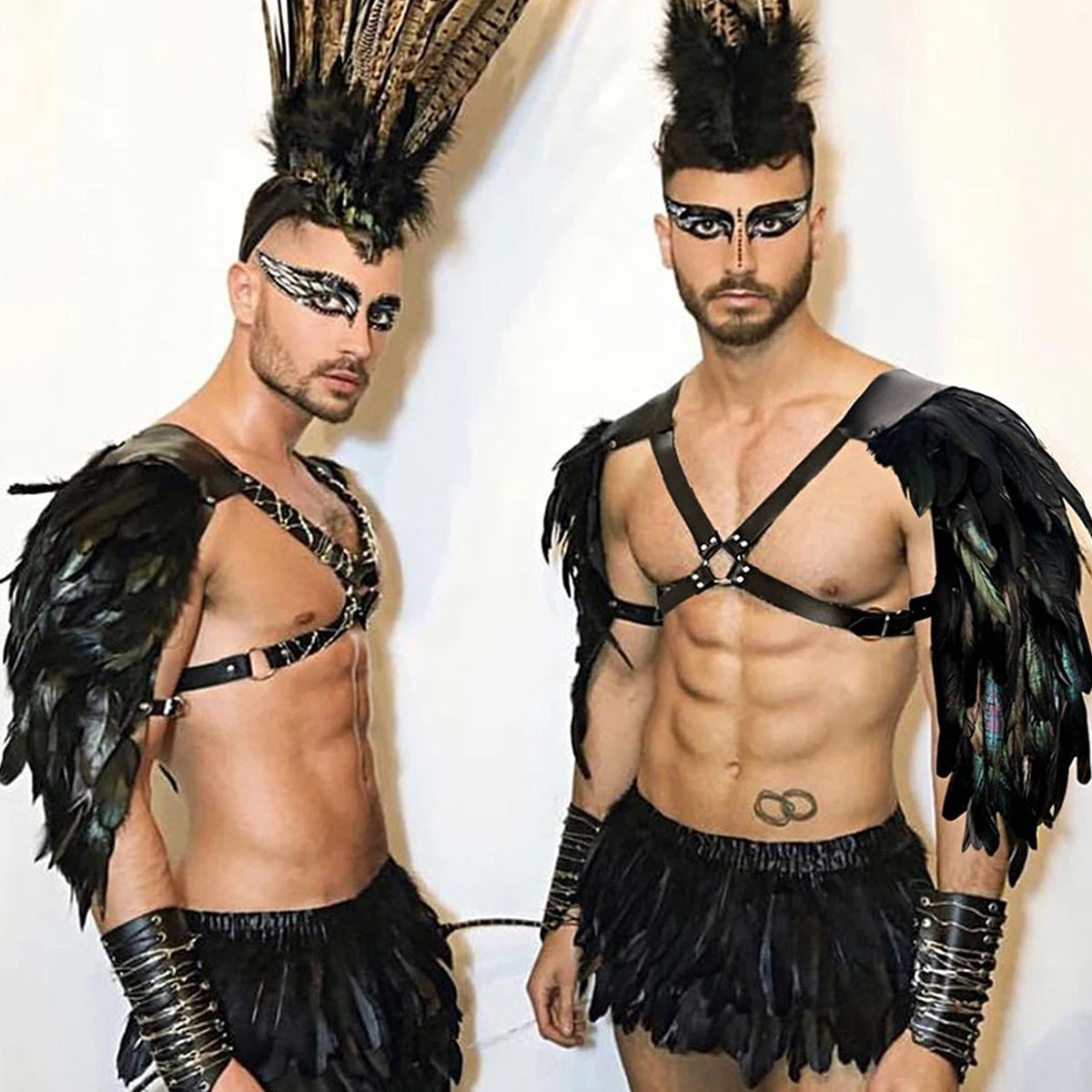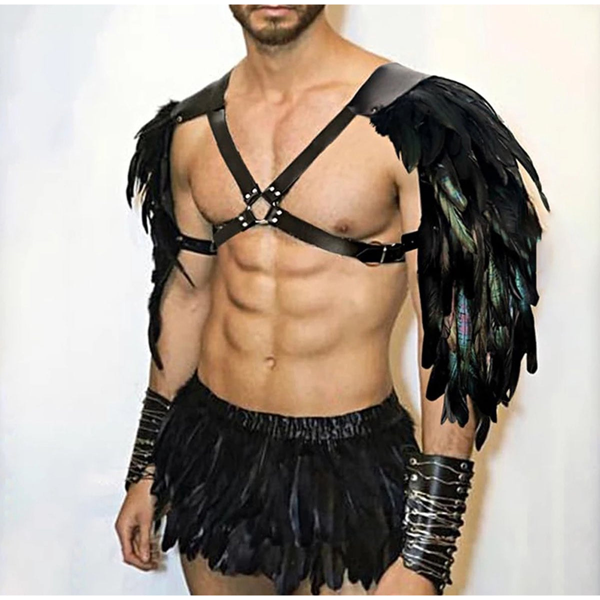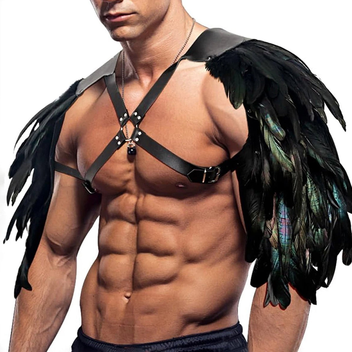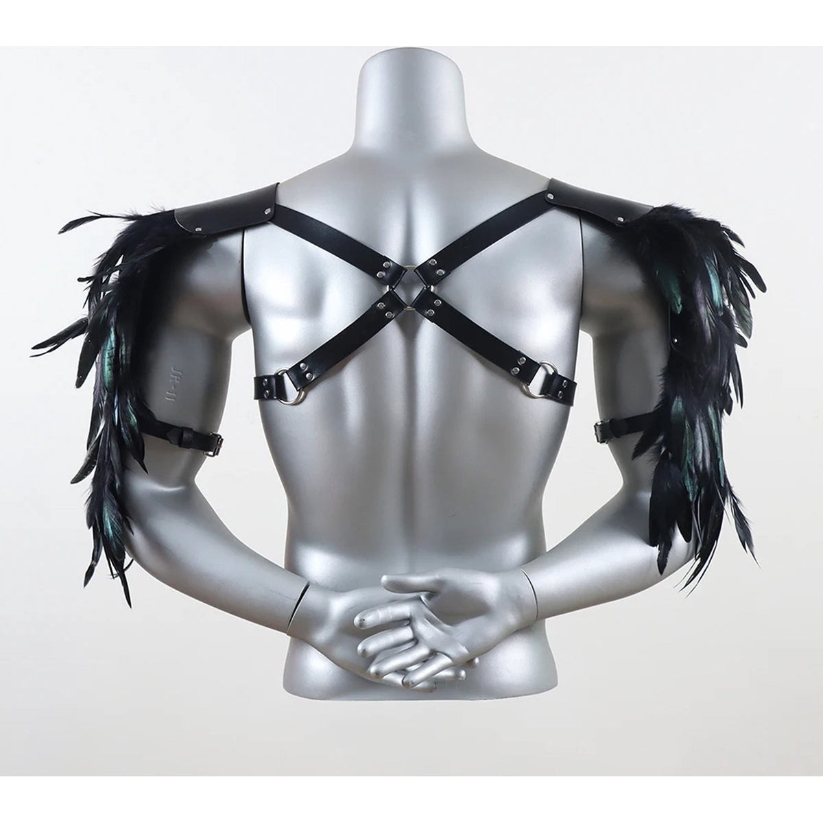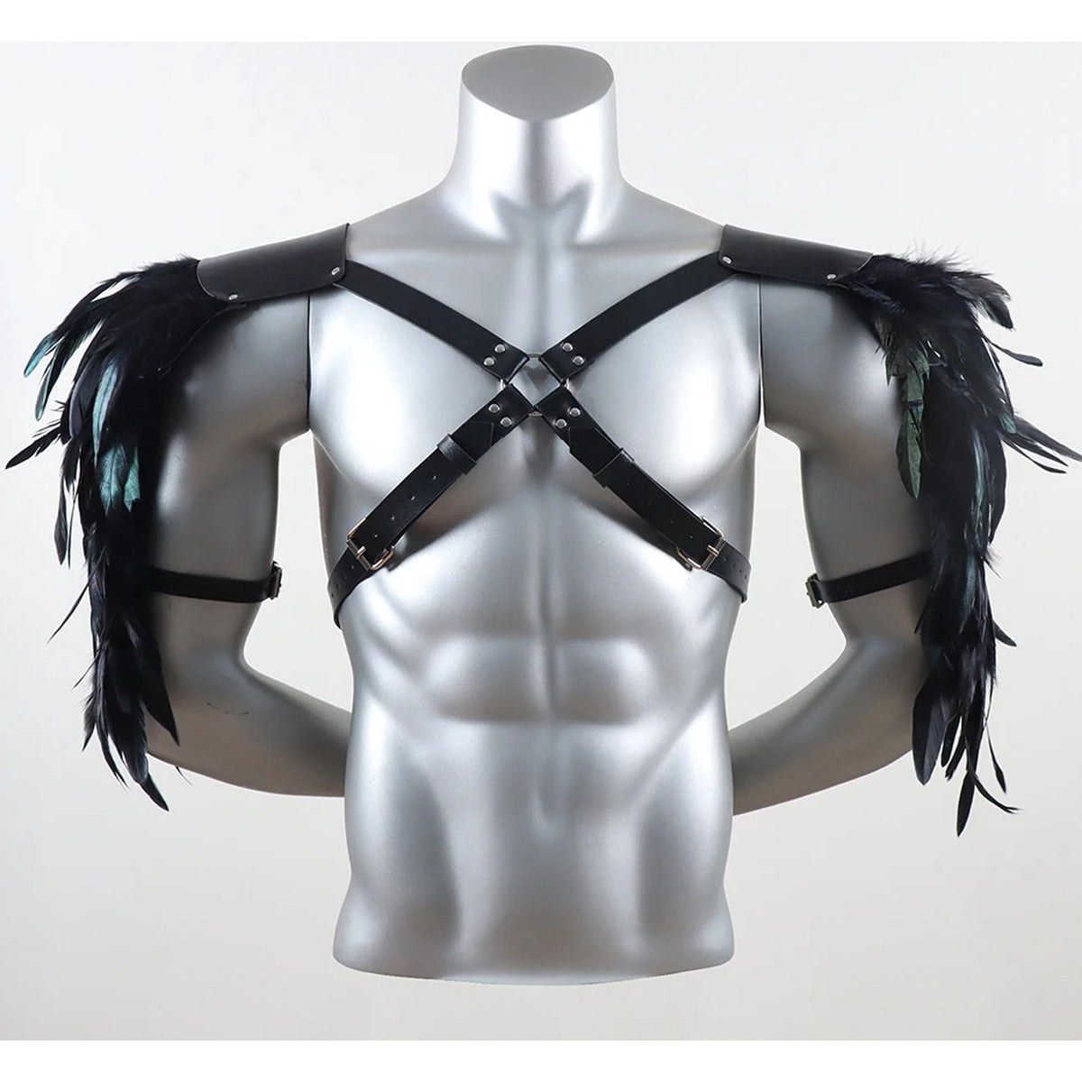 Dit opvallende harnas is vervaardigd uit hoogwaardig BDSM-leer en is ontworpen om de borst en schouders te omarmen, waardoor een krachtige uitstraling ontstaat die zowel verleidelijk als dominant is. De toegevoegde veren zorgen voor een speels accent en voegen een vleugje extravagantie toe aan je look.
