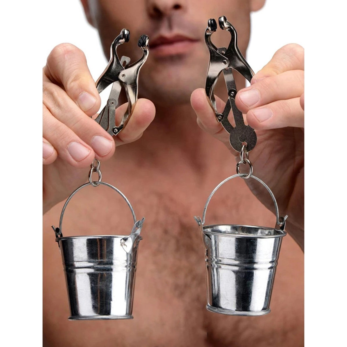 Set van 2 tepelklemmen of schaamlipklemmen met extra gewicht (emmers) voor extreme BDSM-ervaringen.