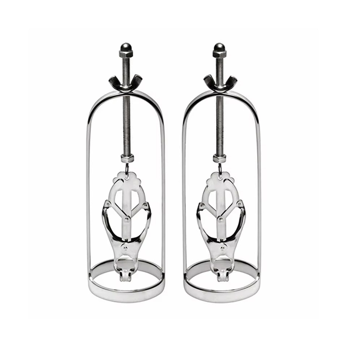 Zeer luxe en gedetailleerde RVS tepelklemmen, volledig verstelbaar voor extreme (BD)SM-ervaringen. Dankzij de lange draaischroeven kunnen deze klemmen naar een zeer hoge pijngrens worden afgesteld, maar ze zijn ook geschikt voor minder harde stimulatie. De set bevat 2 stuks, elk met een gewicht van 300 gram. Afmetingen verpakking: 25 cm hoog, 30 cm lang, 50 cm breed.