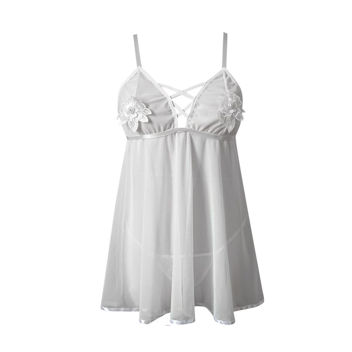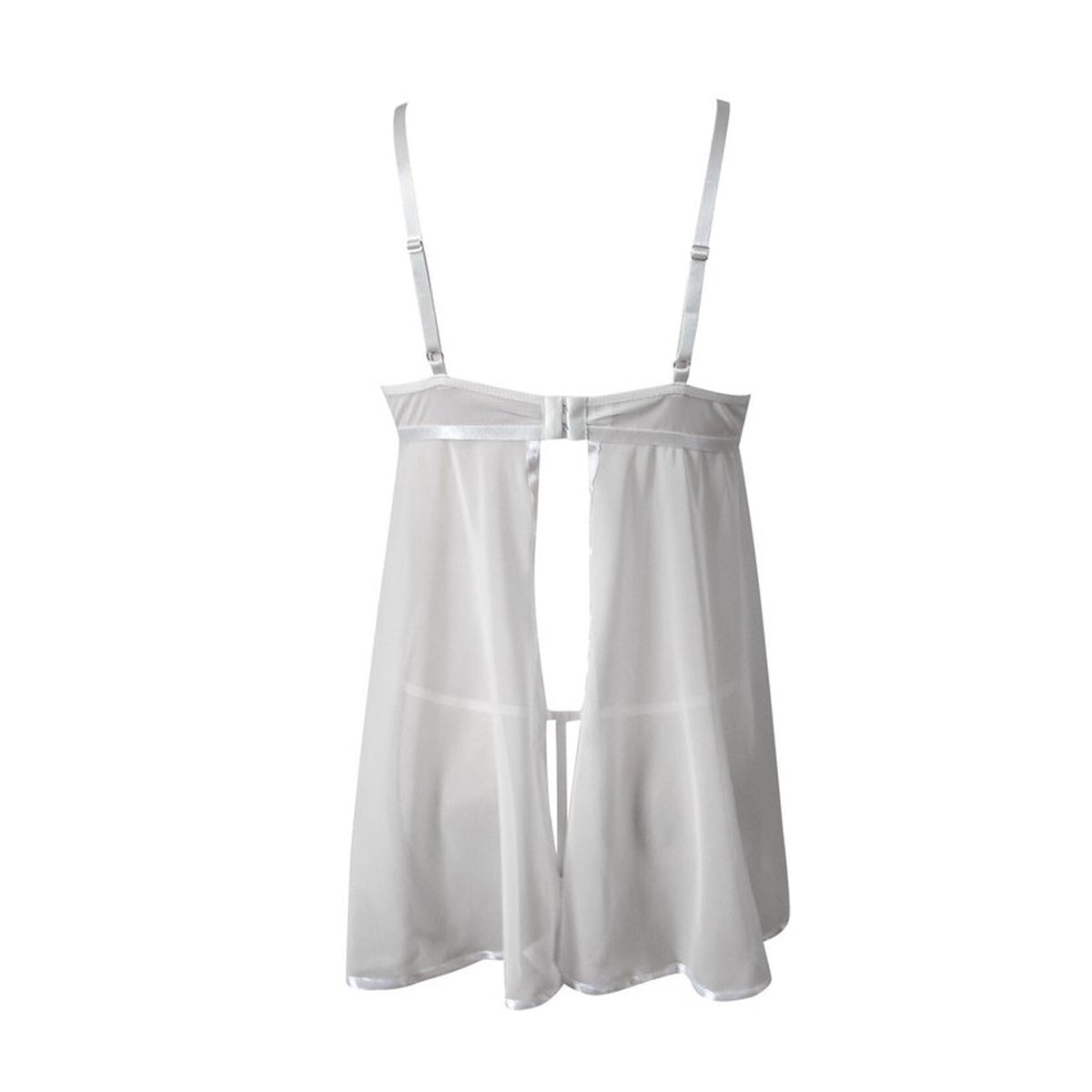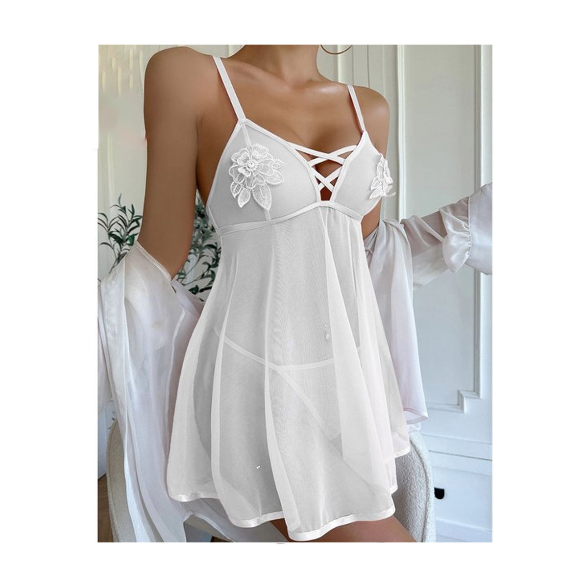 De slaapjurk is mouwloos, waardoor je schouders en armen subtiel kunt blootstellen, wat een praktische verfijning toevoegt aan je look. De transparante stof onthult subtiel een glimp van je huid en laat je vrouwelijke vormen op een elegante manier doorschijnen, waardoor het een opwindende en sensuele uitstraling heeft.